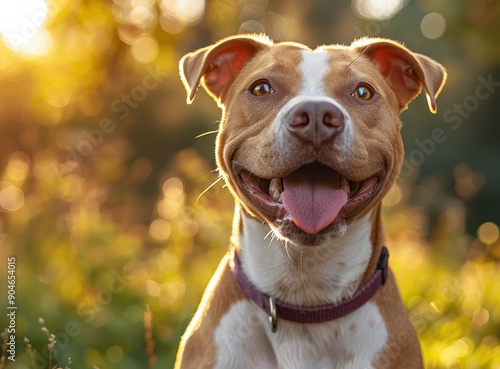 Close-Up Portrait of a Happy White and Brown Pitbull Dog with Tongue Out, Wearing a Purple Collar in a Green Park, Blurred Background with Natural Light