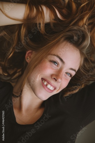 Close-up portrait of a happy young woman with freckles, smiling and looking at the camera.