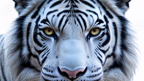 Close-up portrait of a majestic white tiger with intense golden eyes against a white background.