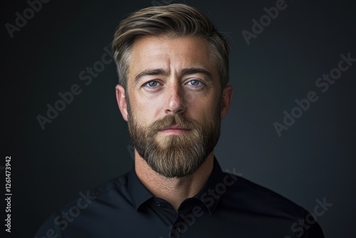 Close-up portrait of a man with a beard, wearing a black shirt against a dark background. Ideal for corporate, professional, or serious themed projects needing a mature male image.