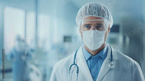 Close-up portrait of a mature male physician in full protective medical gear, including a stethoscope and mask, standing in a hospital room, symbolizing dedication to healthcare an