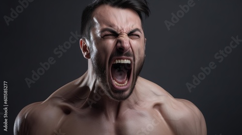 Close-up portrait of a Muscular man shouting on dark background.Generative Ai