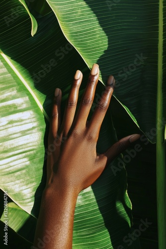 Closeup portrait of a nature activist, who is black, with their hand on a plant