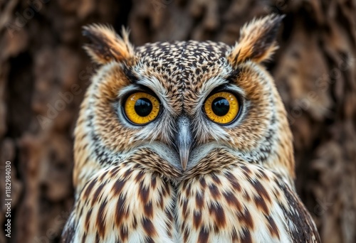Close-up portrait of a tawny owl with piercing yellow eyes and a textured bark background