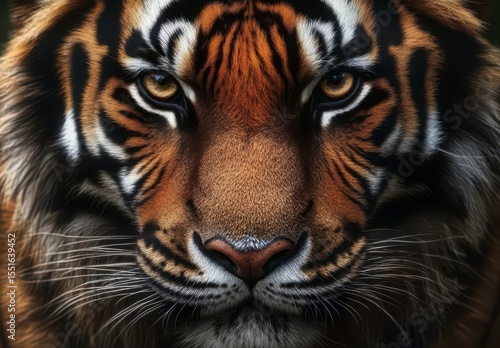 Closeup Portrait Of A Tiger Intense Gaze, Orange And Black Stripes, Dark Background