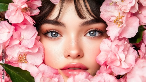Close-up portrait of a woman framed by delicate pink flowers, showcasing her radiant skin and captivating blue eyes, Ideal for beauty, skincare, or floral-themed marketing and editorial projects,