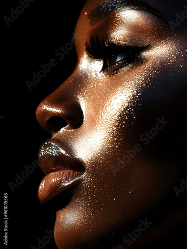 Closeup Portrait of a Woman with Golden Glitter Makeup