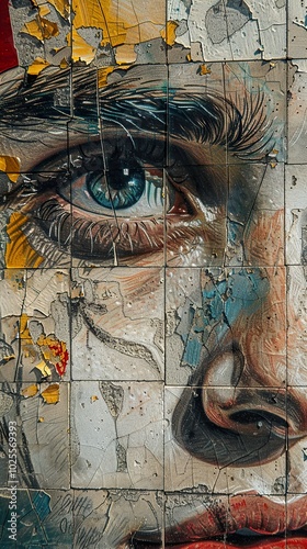 Close-Up Portrait of a Woman's Eye in a Mosaic of Cracked Tiles