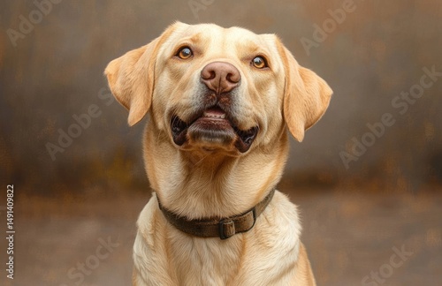 close-up portrait of a yellow labrador retriever dog with attentive and friendly expression wearing a collar against a soft blurred brown background