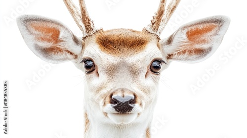 Close-up Portrait of a Young Deer with Antlers against a White Background