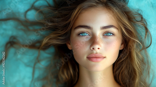 Close-up portrait of a young woman with blonde hair and blue eyes, enjoying a sunny day at the beach.