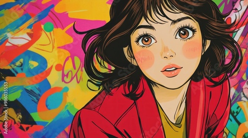 Closeup portrait of a young woman with brown hair and big brown eyes, wearing a red jacket against a colorful graffiti background.