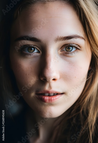 Close-up Portrait of a Young Woman with Freckles and Green Eyes