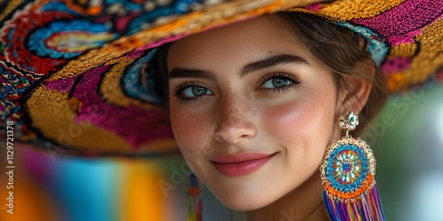 Close-up portrait of a young woman with freckles, wearing a vibrant sombrero and colorful earrings.