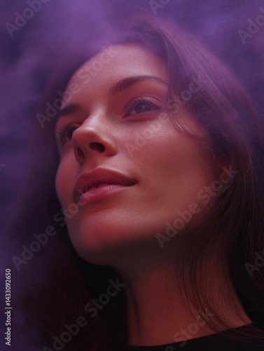 Close-up portrait of a young woman's face. she has long dark hair and is looking up towards the sky with a peaceful expression.