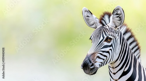 Close-up portrait of a zebra's head and shoulders against a blurred green background.