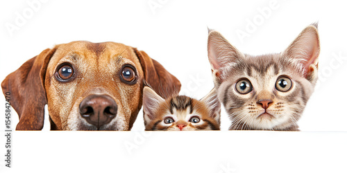Close-up portrait of an adorable domestic cat and dog, cute isolated pets on white