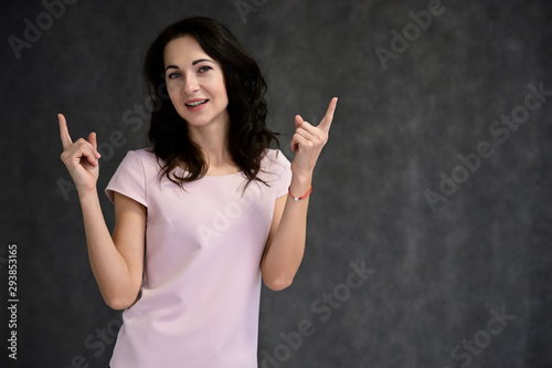 Close-up portrait of an adult pretty brunette woman in a pink t-shirt on a gray background in the studio. Beauty, Art, model posing.