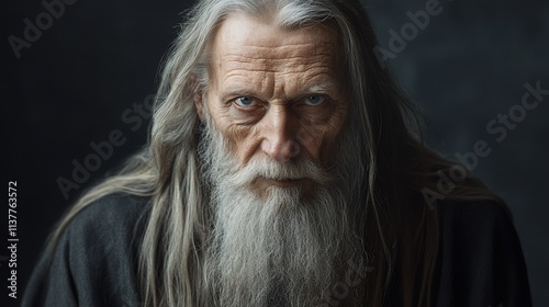 Close-up portrait of an elderly man with long grey hair and beard. He has an intense gaze and serious expression. The image is a studio shot against a dark background.