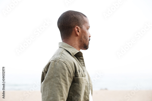 Close-up portrait of black young man walking on beach towards water and looking aside. Outdoor.
