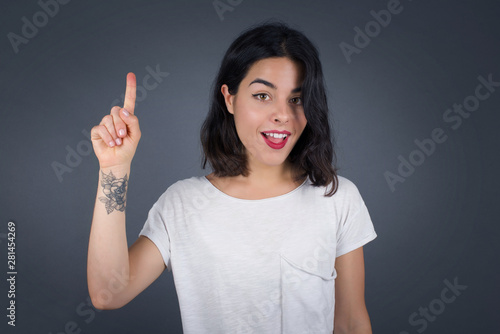 Close-up portrait of charming young blonde hipster woman in casual clothes pointing with one finger up, looking up and smiling, I have an idea, I know the answer or the solution.