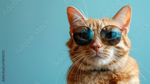 Closeup portrait of funny ginger cat wearing sunglasses isolated on light cyan. Copyspace