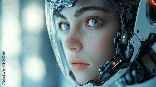 Close-up Portrait of Futuristic Female Robot with High-Tech Helmet