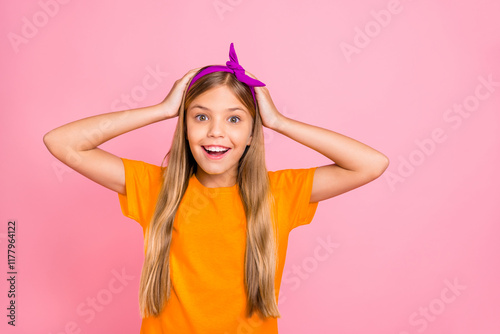 Close-up portrait of her she nice attractive winsome lovely cheerful cheery pre-teen girl wearing yellow t-shirt amazement expression isolated over pink pastel background