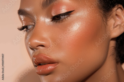 Close-up Portrait of Model with Radiant Makeup and Glossy Skin
