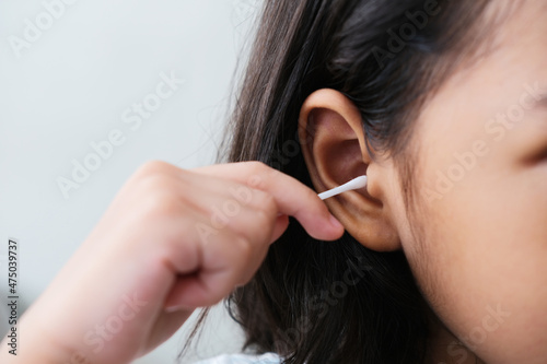 Closeup portrait of person hand putting cotton bud stick inside her ear