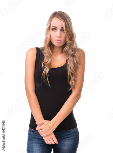 Closeup portrait of sad and depressed woman isolated on white