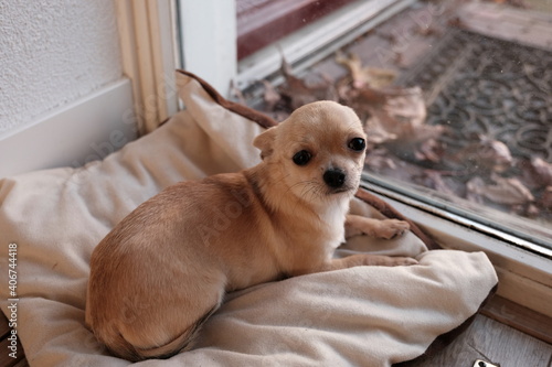 Closeup portrait of small funny beige mini chihuahua dog, puppy waiting near the window