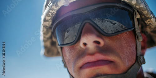 Close-up Portrait of Soldier Wearing Camouflage Helmet and Protective Eyewear