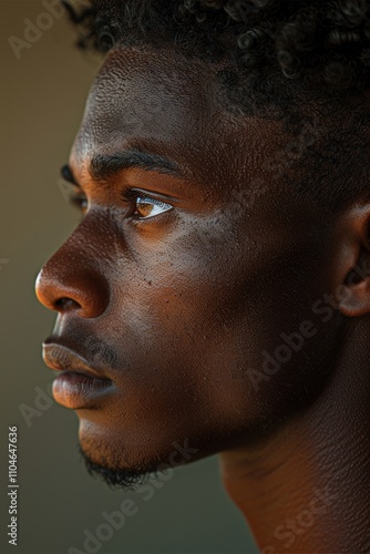 Close-up Portrait of Thoughtful Young Man with Intense Gaze and Detailed Texture on Skin in Warm Lighting with Focus on Profileportrait