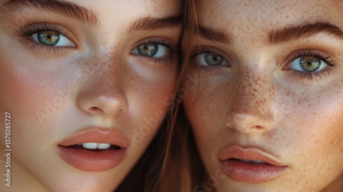 Close-up Portrait of Two Young Women with Freckles and Green Eyes