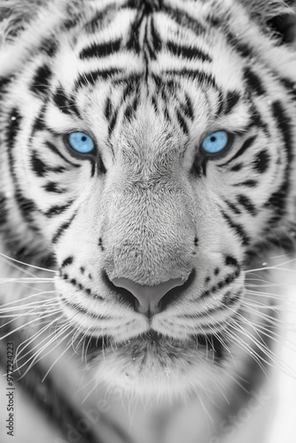 Close-up portrait of white tiger with blue eyes and fur patterns in natural light. Generative AI