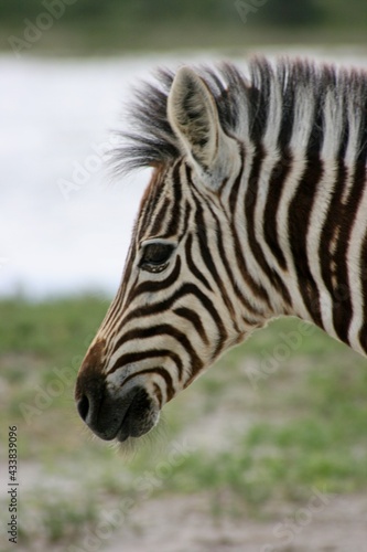 Closeup portrait of wild Burchell's Zebra (Equus quagga burchellii) looking side on Etosha National Park, Namibia.