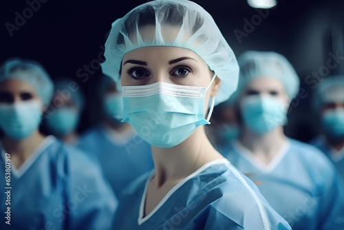 Closeup portrait of young female EMS key worker doctor in front of healthcare colleagues, wearing protective PPE face mask and looking at camera in hospital.
