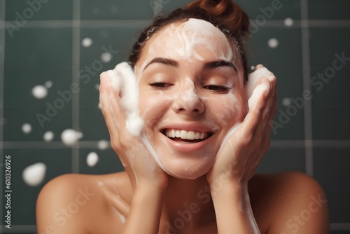 Closeup portrait of young woman cleanses the skin with foam on her face in bathroom