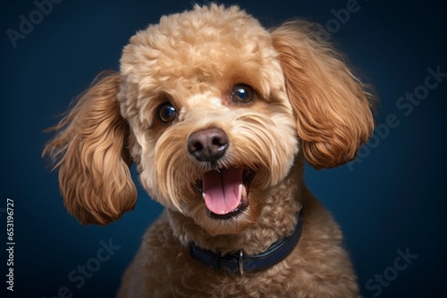 Close-up portrait photography of a cute poodle wearing a cashmere sweater against a navy blue background. With generative AI technology
