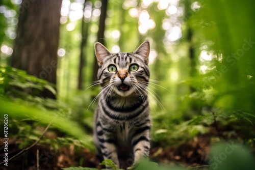 Close-up portrait photography of a happy american shorthair cat exploring against a forest background. With generative AI technology