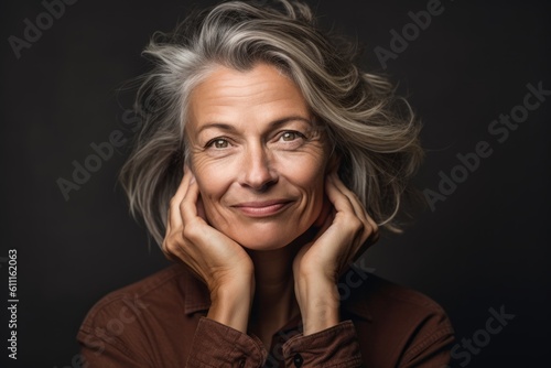 Close-up portrait photography of a satisfied mature woman scratching one's head in a gesture of confusion against a rustic brown background. With generative AI technology
