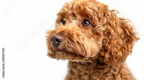 Close-up portrait view of adorable Red Toy Poodle dog head and face looking from side view isolated on white background