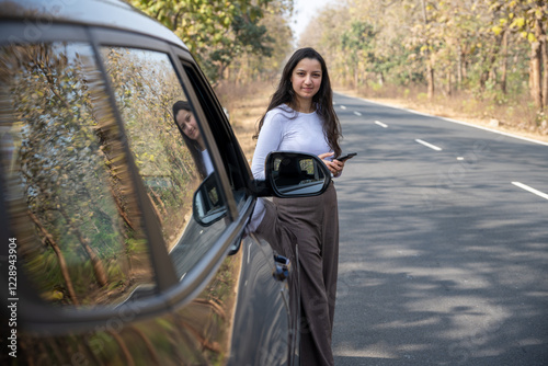 Closeup portrait young frustrated upset annoyed woman near her broken car calling for help on cell