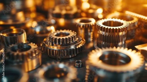 Close-up precision mechanics showing stacked bearings, gears on workshop workbench. High quality metal components for repair industry. Metal parts, tools for machinery, engineering, maintenance