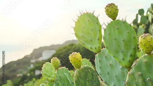 Closeup Prickly Pear Cactus Pads and Fruit Sunset