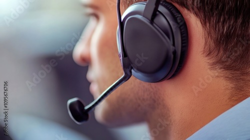 Close-up profile of a man wearing a headset, focused on his work.