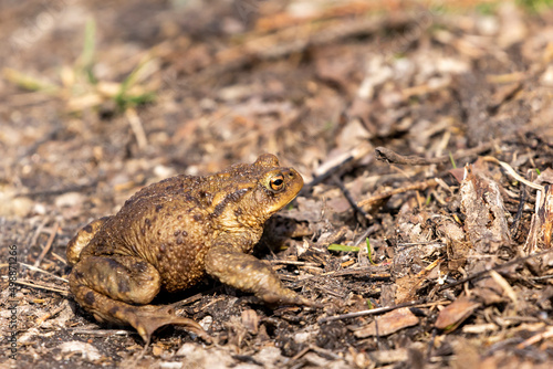 Closeup profile of the amphibian, common toad also known as European toad (Bufo bufo) sitting on the ground in spring in Estonian nature