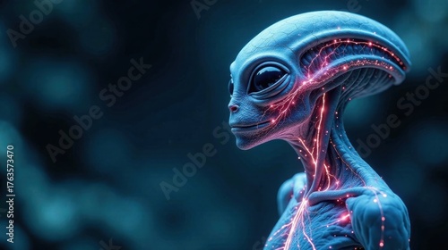 Close-up profile view of a bioluminescent extraterrestrial being, showcasing intricate vascular network glowing faintly against a dark backdrop.