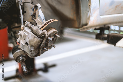 closeup repair disc brakes of car with soft-focus and over light in the background